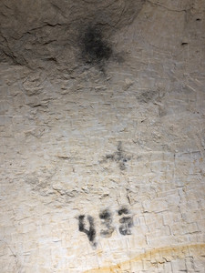 - La seconde - elle aussi laissée au plafond et au noir de fumée – se compose d’une série de trois chiffres : « 933 », ainsi qu’une croix. Nous pensons qu’il s’agit ici de la profondeur estimée par les allemands du sol du tunnel jusqu’à la surface (soit 9m33). Notre topographie révèle qu’en ce point précis, la surface se trouve en 2024 à 8m45 du sol du tunnel. Tout laisse donc à penser qu’il y a de 108 ans le sol du champ de bataille était plus haut. La différence étant d’à peine 88cms, l’hypothèse que la technologie moderne est bien plus précise qu’à l’époque peut être retenue.
